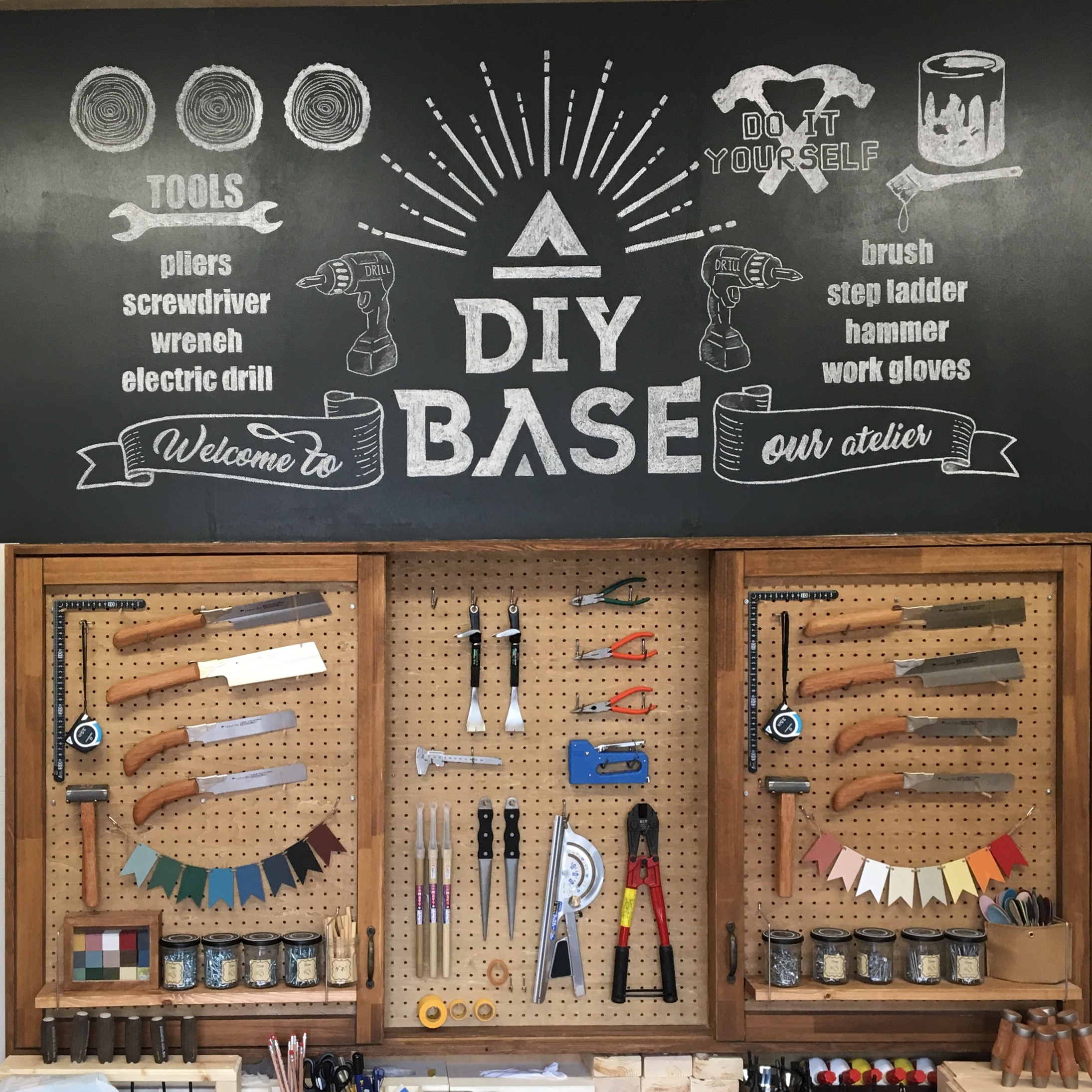工房にある工具、端材、塗料など自由に使えます。